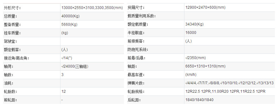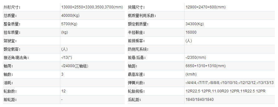 輪胎規(guī)格 | 12R22.5 12PR,11.00R20 12PR | 鋼板彈簧片數(shù)(前/后) | -/8/8/8,-/9/9/9,-10/10/10 |